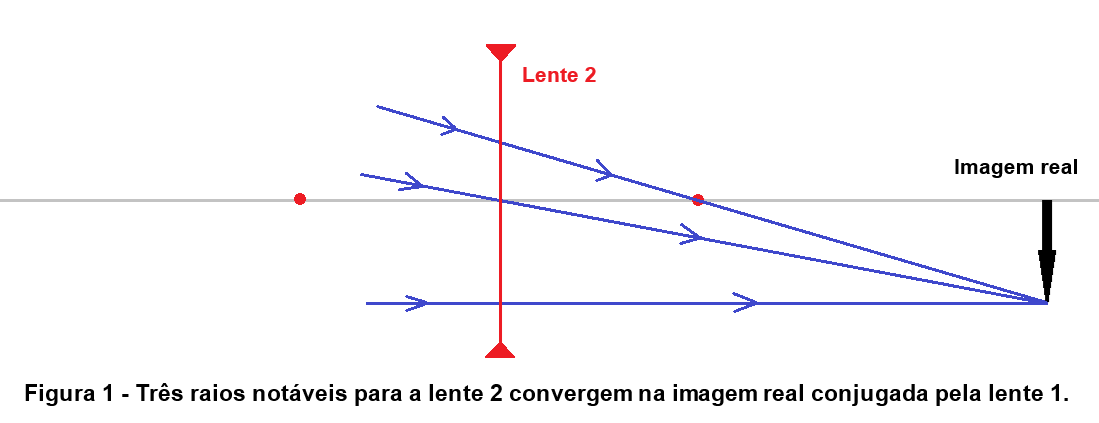 Para se construir graficamente a imagem conjugada pela lente 2 se inicia considerando-se a imagem real e invertida conjugada pela lente 1. A Fig.1 representa três raios notáveis (raio paralelo ao eixo principal, raio que passa pelo centro óptico e raio que passa pelo foco da lente 2) que convergem na imagem real conjugada pela lente 1.