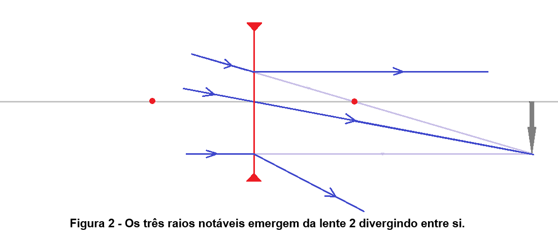 Como a lente 2 está posicionada antes da imagem real conjugada pela lente 1, esta imagem real é um objeto virtual para a lente 2. Os três raios notáveis são desviados pela lente 2 conforme está indicado na Fig. 2. Eles emergem da lente 2 divergindo e, portanto, a lente 2 conjuga uma imagem virtual.