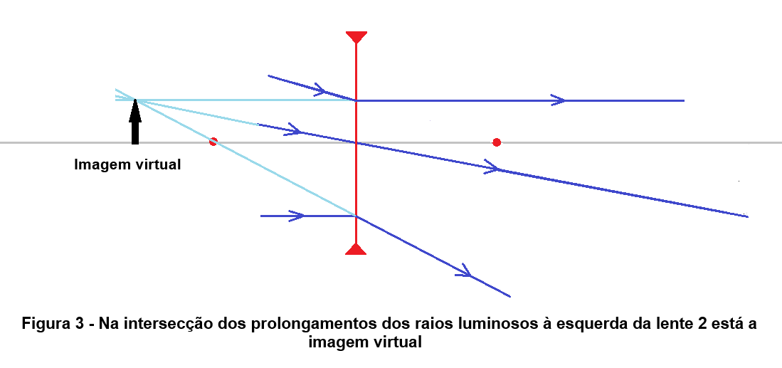 Para se encontrar a imagem virtual conjugada pela lente 2 os raios que emergentes são prolongados à esquerda da lente. Na intersecção dos prolongamentos dos três raios está localizada a imagem virtual, indicada na Fig. 3.