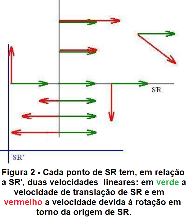 Então pontos solidários ao sistema SR possuem simultaneamente, em relação ao sistema SR’, duas velocidades lineares. Em alguns pontos estão representadas na figura 2 as duas velocidades: por setas verdes, com a mesma orientação e intensidade, as velocidades devida à translação de SR; por setas vermelhas estão representadas as velocidades devidas à rotação em torno da origem. As setas vermelhas possuem intensidades proporcionais à distância que o ponto considerado se encontra da origem do sistema SR (por onde passa o eixo de rotação) e estão cruzadas (são perpendiculares) com o raio vetor que vai da origem de SR até o ponto considerado.