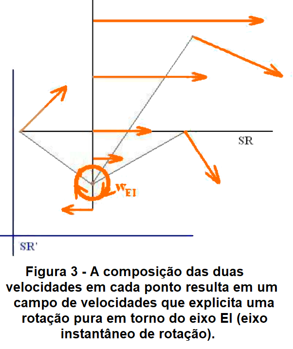 A velocidade que um particular ponto solidário a SR possui em relação a SR’ é a composição das duas velocidades (soma vetorial) representadas em verde e vermelho. Esta composição resulta em um campo de velocidades em relação a SR’ representado em cada ponto por um seta laranja na figura 3. Este campo de velocidades mostra (e isto é possível de se provar rigorosamente) que o sistema SR está, neste instante representado, apenas girando em torno de um eixo indicado na figura por EI. Este eixo, em torno do qual neste instante (instantaneamente) o sistema SR apenas gira é denominado EIXO INSTANTÂNEO DE ROTAÇÃO (EI).