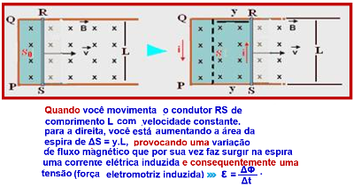 A força eletromotriz (FEM) decorre de que o condutor RS está em movimento através de uma região onde existe um campo magnético. Se a espira estivesse interrompida ou se apenas existisse o condutor RS em movimento, existiria uma FEM induzida no condutor RS (pois é ali no trecho RS que a fem se localiza). Neste caso não haveria corrente estacionária (apenas um transiente de corrente que levaria o condutor a se polarizar) pois quando o condutor se polariza, em qualquer uma de suas cargas livres existem duas forças opostas: a força magnética devida ao movimento através do campo magnético e a força elétrica consequente da polarização. Estas duas forças então levam a uma resultante das forças nula, não havendo portanto condições para sustentar o movimento de deriva das cargas livres no sistema de referência do condutor.