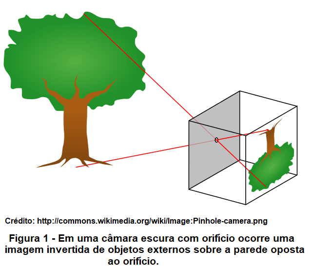 A Fig. 1 indica que um pequeno orifício em uma câmara escura (com pouca ou nenhuma luz além daquela que entra pelo orifício) conjuga uma imagem invertida, de um objeto externo à câmara, na parede oposta ao orifício.