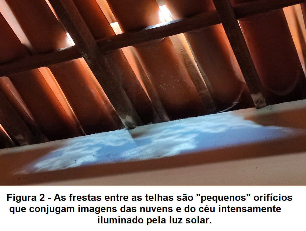 Cada fresta no telhado da Fig.2 é um “pequeno” orifício que deixa entrar luz solar proveniente do céu e das nuvens. Então cada fresta no telhado conjuga sobre a parede interna uma imagem do céu e das nuvens. No caso da Fig.2 há notoriamente duas imagens contíguas e semelhantes, do mesmo céu e nuvens na parede, parcialmente superpostas. Cada imagem é produzida por uma fresta no telhado.