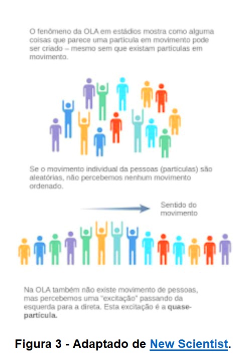[3] Uma analogia que permite entender o que é uma quase-partícula é a OLA nos jogos de futebol. O movimento coletivo dos torcedores de forma sincronizada, passa a impressão de propagação de uma onda pelas arquibancadas. A figura 3 ilustra esta situação.