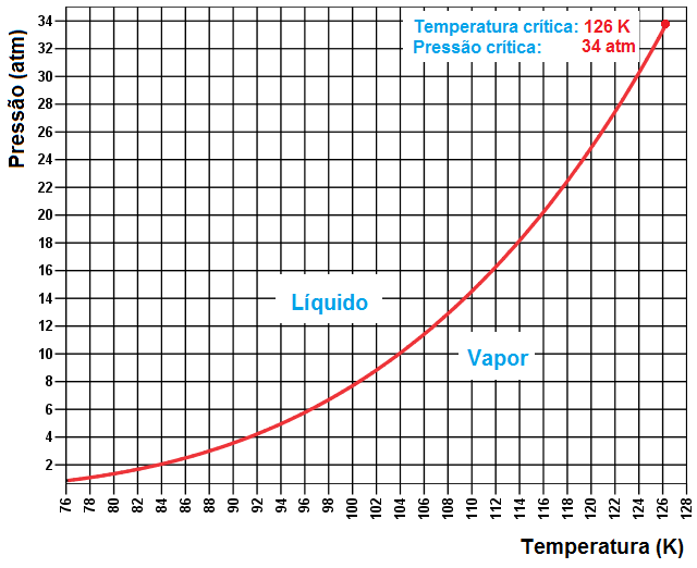 A linha vermelha que descreve o comportamento da pressão de vapor saturado acaba no ponto crítico, isto é, a 126 K e 34 atm. Acima da temperatura de 126 K não mais é possível, por mais que se aumente a pressão, liquefazer o nitrogênio. Ou seja, em temperaturas superiores a 126 K a fase gasosa não é mais VAPOR, sendo então denominada da GÁS.