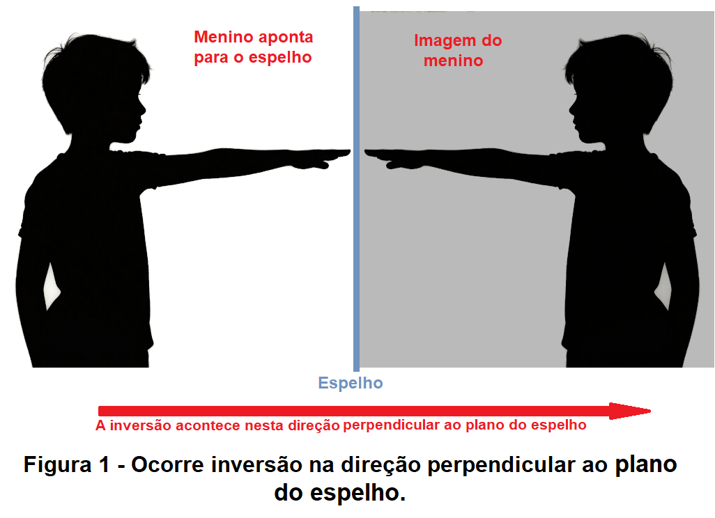 Um espelho plano colocado verticalmente (como é usual nos espelhos do nosso cotidiano) não inverte a nossa imagem verticalmente e também não troca esquerda pela direita, não inverte nossa imagem horizontalmente no plano do espelho. Entretanto existe uma inversão da imagem em relação ao objeto e esta ocorre na direção perpendicular ao plano do espelho (frontal à pessoa que se olha no espelho) conforme está indicado na Fig. 1.
