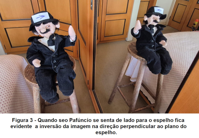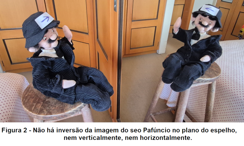 A Fig. 2 mostra seo Pafúncio sentado quase frontalmente a um espelho plano. Quando comparamos seo Pafúncio à sua imagem constatamos que não ocorre inversão da imagem na vertical e a seta no chapéu do seo Pafúncio ajuda a perceber que também não há inversão da imagem na direção horizontal contida no plano do espelho.